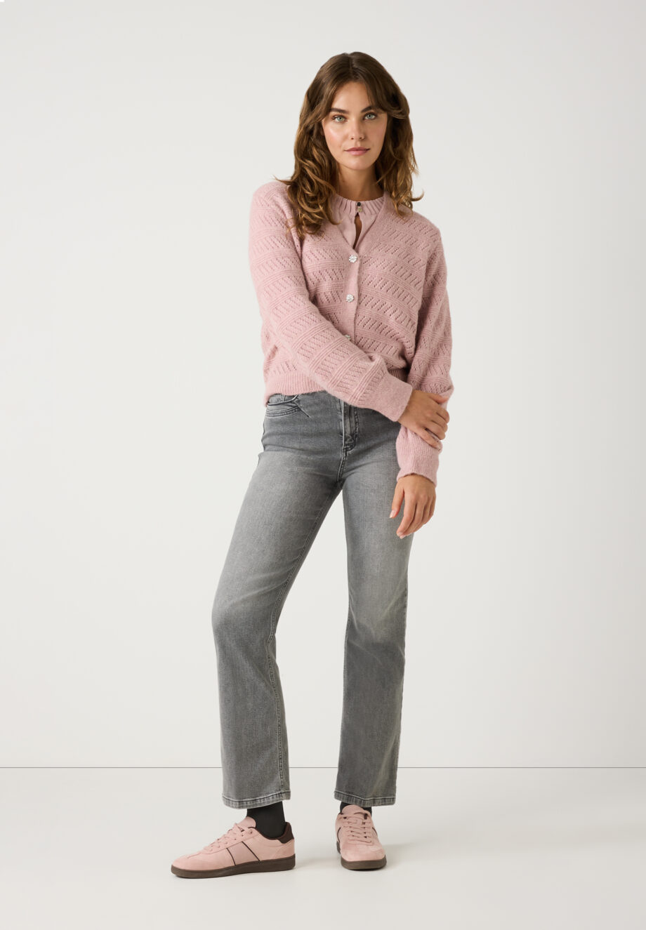 Die kurze Strickjacke von MORE & MORE mit zartem Ajour-Lochmuster und dekorativen Schmuckknöpfen passt hervorragend zu femininen Kleidern und Röcken, kann aber genauso gut mit lässiger Jeans oder weiter Bundfaltenhose kombiniert werden.