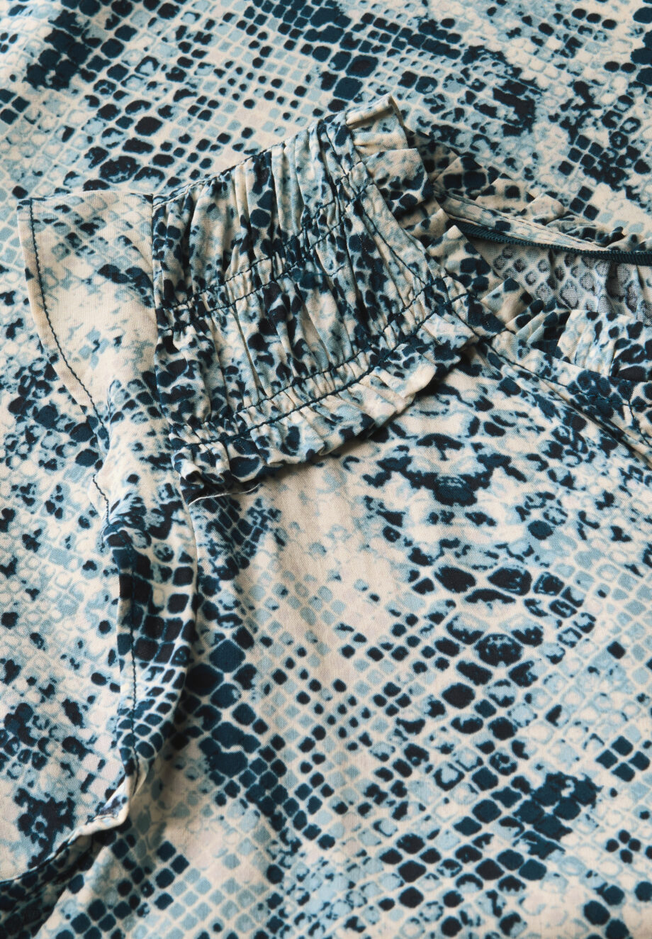Das ärmellose Blusentop von Street One für Damen bringt mit seinem grafischen Muster und den Rüschen-Details frischen Wind in deinen Sommerlook. Split Neck und Bindebänder runden das Design feminin ab, während die leichte Viskose für ein angenehmes Tragegefühl sorgt. Perfekt für luftige Outfits mit verspieltem Flair. Ärmelloses Blusentop Split Neck mit Rüschen und Bändern Rüschendetails am Armansatz Grafisches Muster Weiche Viskose Material: 100% Viskose