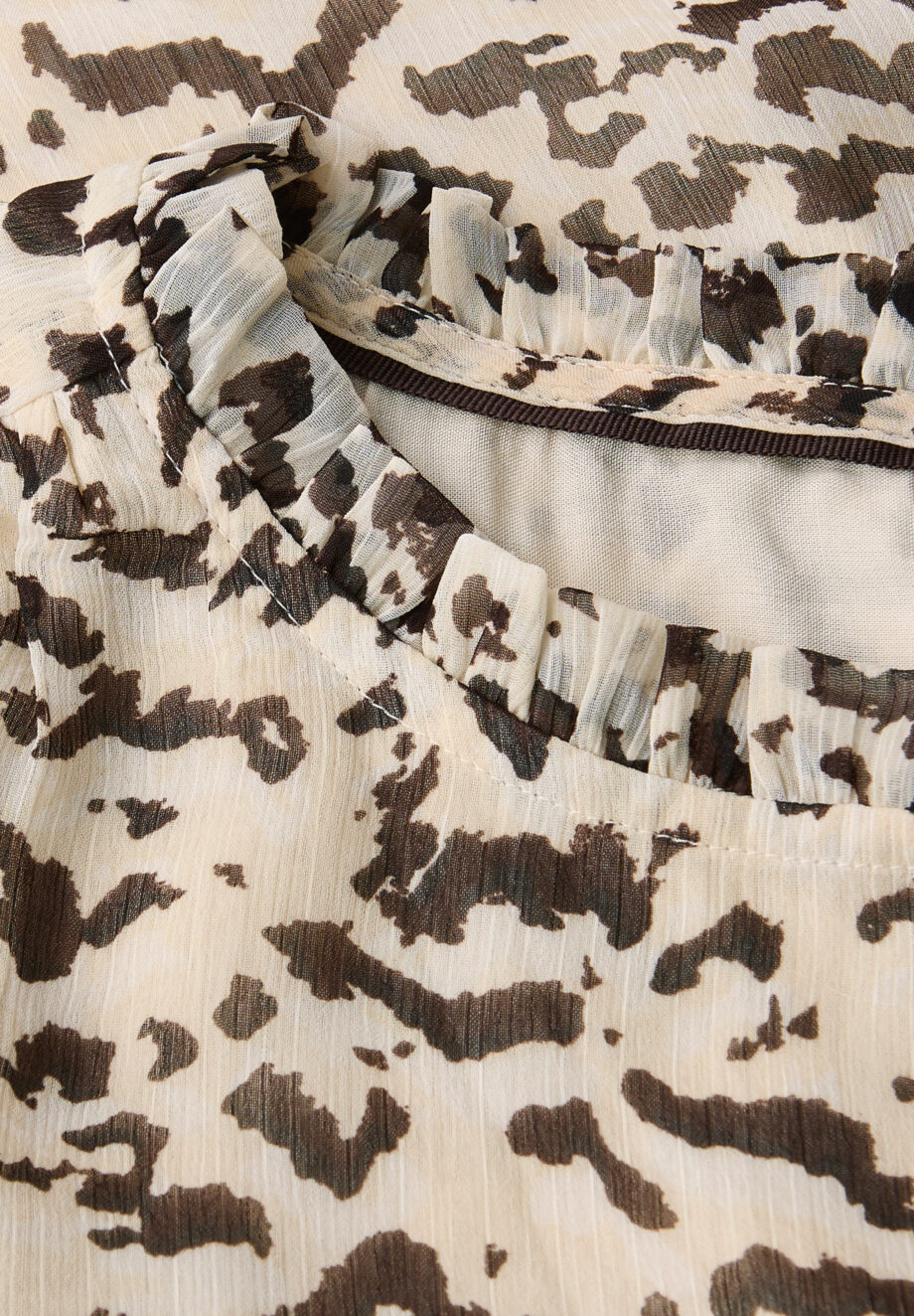 Die Chiffon-Tunika von Street One für Damen überzeugt mit femininer Raffinesse und grafischem Muster. Rüschen am Ausschnitt, ein dezenter Cut-Out und die gesmokten Bündchen an den Ärmeln setzen verspielte Akzente. Die leichte Qualität und die zarte Raffung an den Schultern sorgen für eine fließende Silhouette und angenehmen Tragekomfort. Damenbluse Ausschnitt mit Rüschen und Cut-Out Langarm mit Smok-Bündchen Feminine Raffung an den Schultern Grafisches Muster Material: Obermaterial: 100% Polyester; Futter: 100% Modal