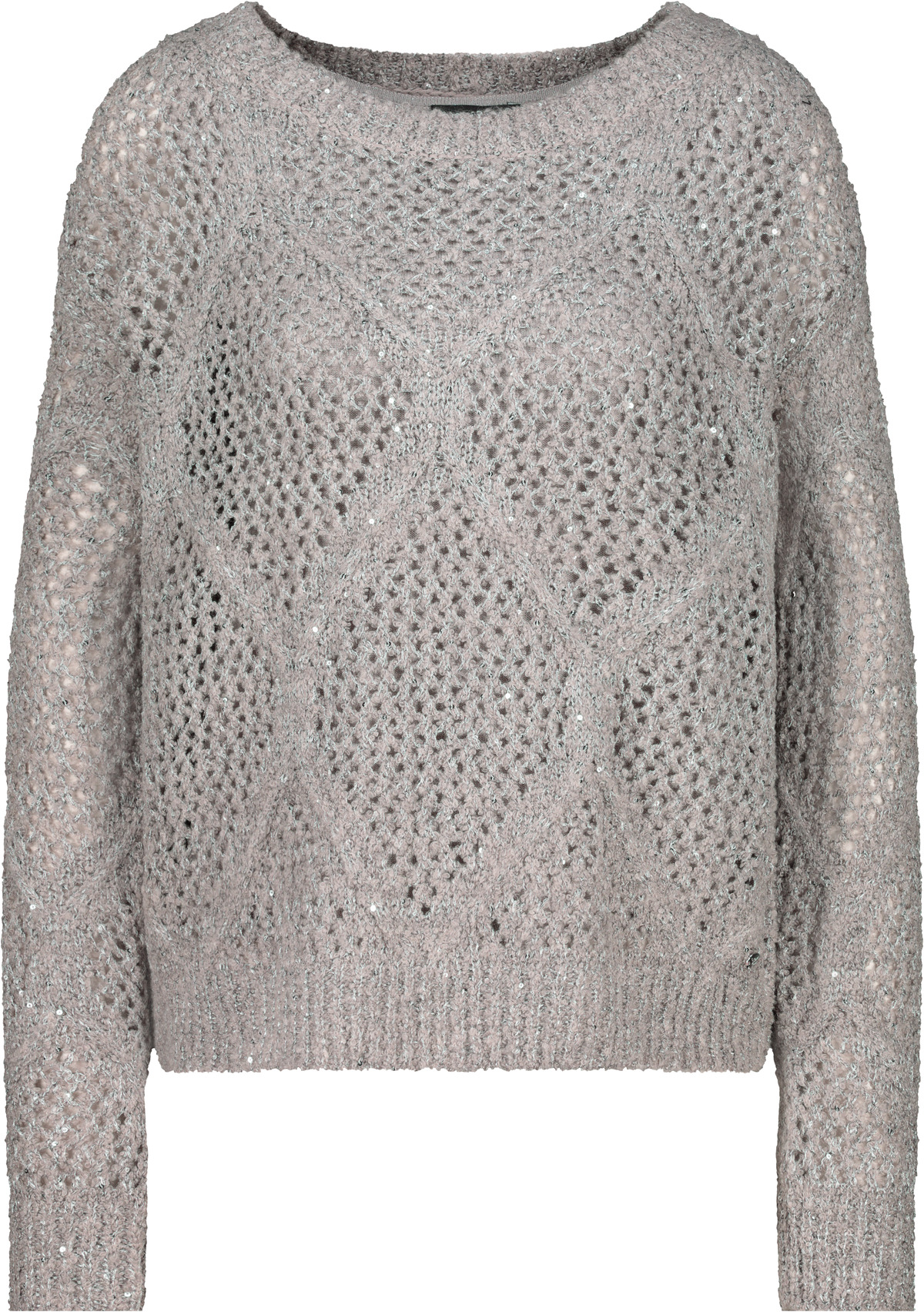 Eleganter Ajour-Pullover aus hochwertiger Baumwollmischung mit fließender Viskose, glitzerndem Lurex und Pailletten. Überschnittene Schultern und feines Ajourmuster verleihen ihm eine feminine, stilvolle Ausstrahlung.