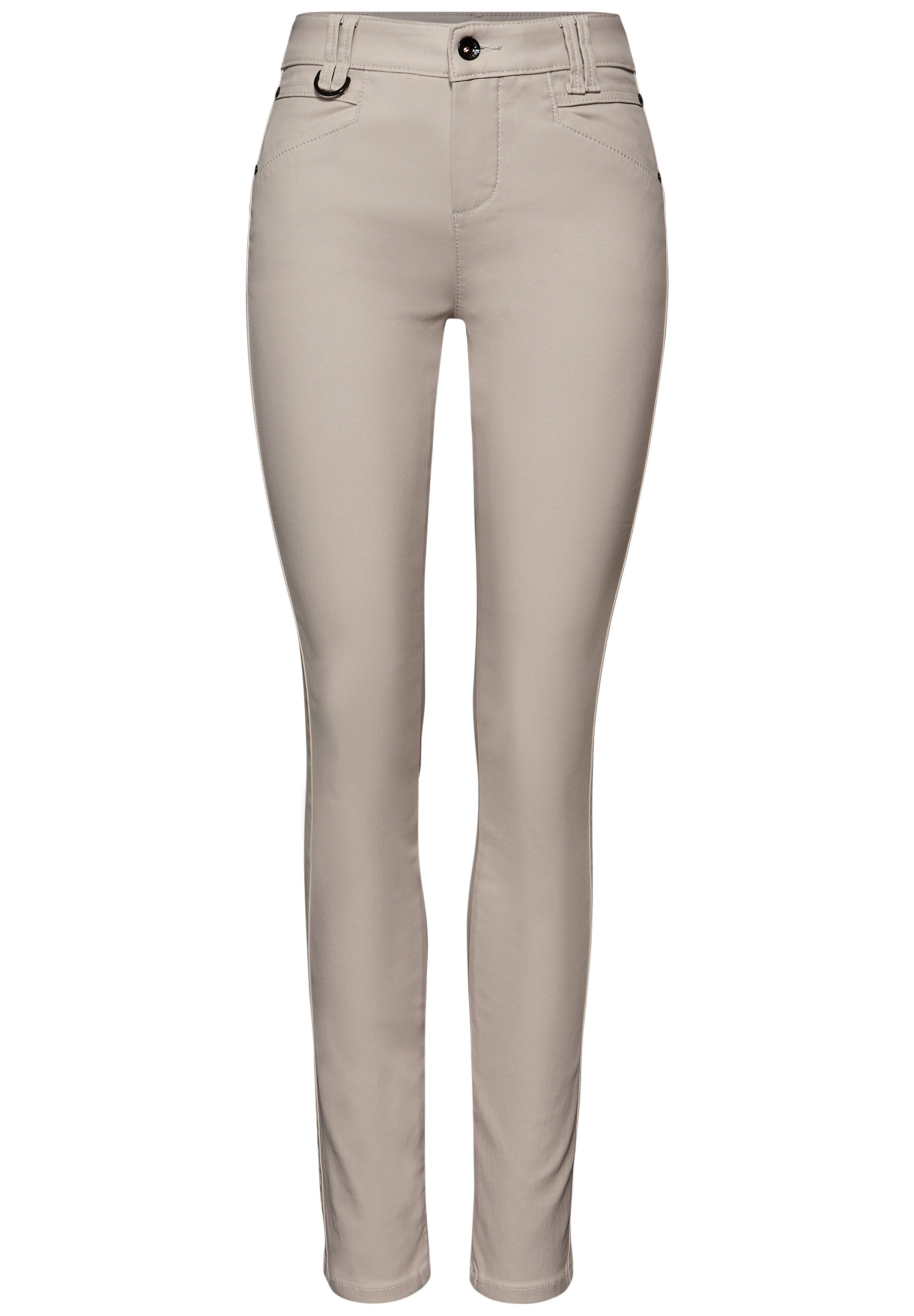 Die beschichtete Hose im Style York von Street One für Damen punktet mit einer schlanken Passform. Mid Waist und Slim Legs sorgen für eine figurbetonte Silhouette, während der Materialmix mit Stretchanteil hohen Tragekomfort garantiert. Damenhose Mid Waist und Slim Legs Seitliche Taschen Angenehmer Tragekomfort Material: 79% Viskose, 18% Nylon, 3% Elasthan