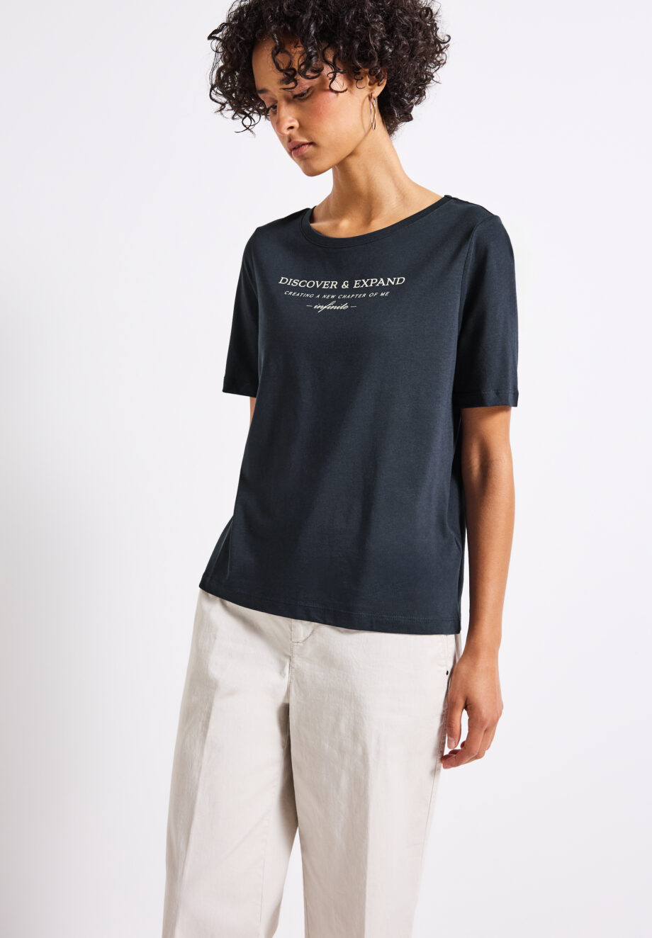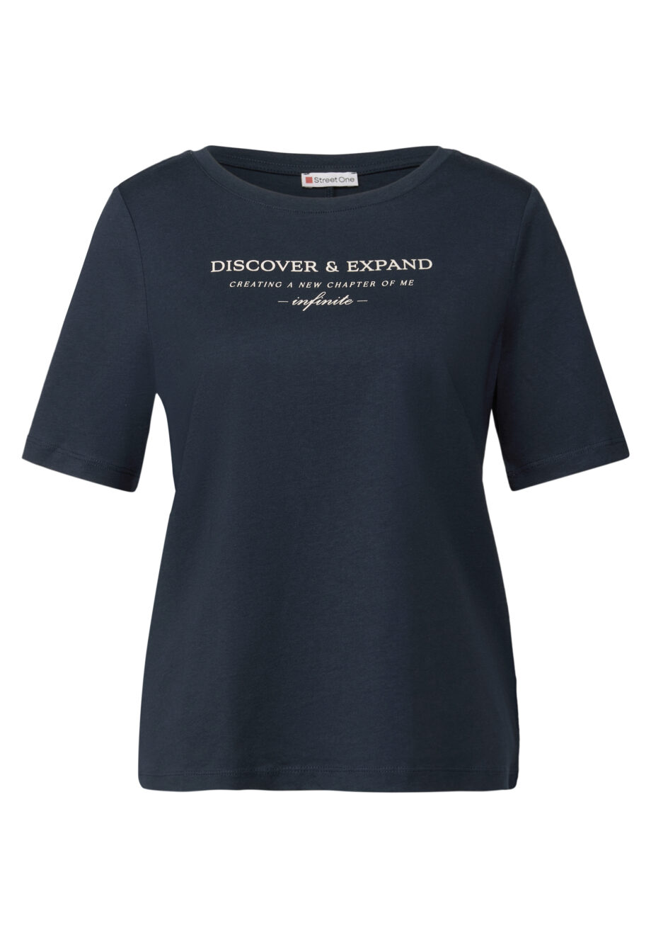 Dieses Kurzarmshirt von Street One für Damen ist ein Basic mit besonderem Detail. Das Wording Artwork auf der Front setzt ein modisches Statement, während der weiche Baumwoll-Modalmix für hohen Komfort sorgt. Ein vielseitiger Stylingpartner für entspannte Casual-Outfits. Kurzarmshirt Rundhalsausschnitt Wording Artwork Softer Baumwoll-Modalmix Material: 50% Baumwolle, 50% Modal